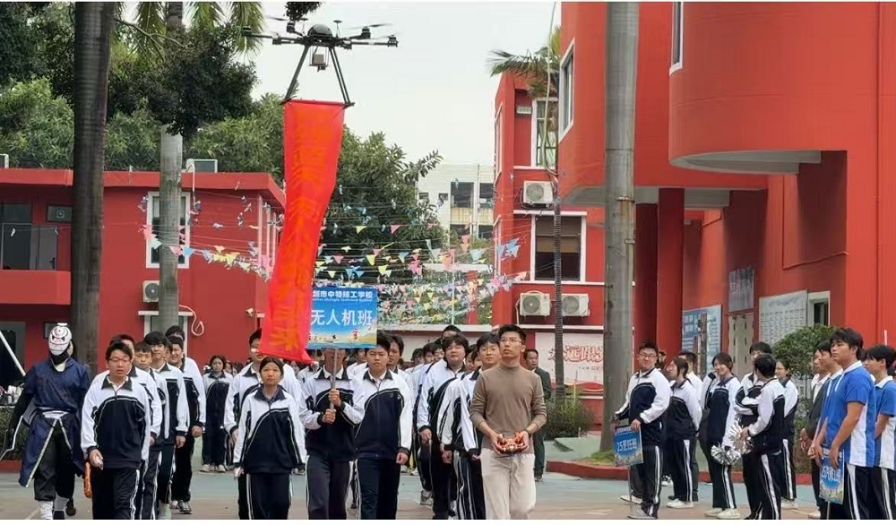 各班级代表队与啦啦队依次亮相,同学们精神抖擞、神采飞扬,嘹亮的口号响彻操场,创意十足的舞蹈表演、整齐划一的队列展示,充分展现了班级的凝聚力与中特学子的蓬勃活力。最令人耳目一新的当属无人机方队,无人机悬挂着“智领蓝天,无人机翱翔未来”励志条幅,在操场上空精准穿梭、灵活盘旋,以科技赋能的创新形式惊艳登场,独特的入场方式引得全场掌声雷动、喝彩不断,为开幕式增添了别样的科技魅力与时代风采。