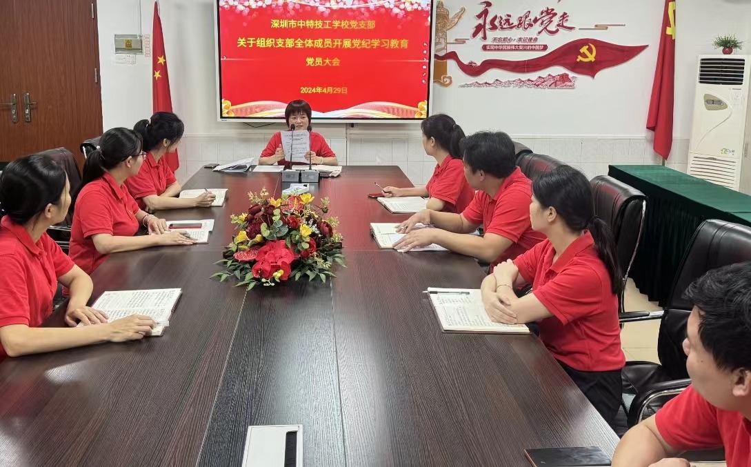 4月29日,深圳市中特技工学校党支部组织全体成员召开了2024年第二季度党员大会,亦是支部关于组织开展党纪学习教育专题动员大会。
